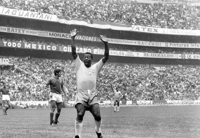当地时间1970年6月21日,墨西哥城,1970年世界杯决赛,巴西4-1意大利。第18分钟,贝利头球首开记录,这是巴西队在世界杯上的第100粒入球,也是“球王”最后的一粒世界杯入球。图片来源:ICPhoto-416949253278987375