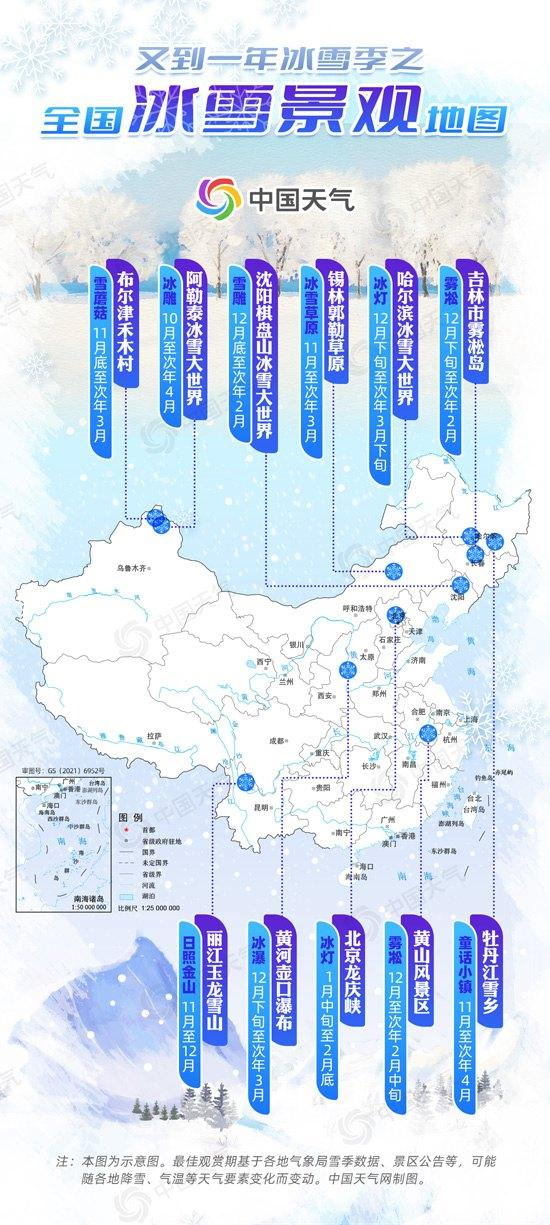 中国天气网讯 时值12月末,我国大部已是隆冬时节,冰雪景观也陆续迎来一年中最佳的观赏期。冰雪覆盖的童话小镇、晶莹剔透的雾凇、雄伟壮丽的冰瀑奇观都让人不禁感叹大自然的鬼斧神工;冰灯、雪雕等人造冰雪景观,同样令人目不暇接。又到一年冰雪季,中国天气网推出全国冰雪景观地图,一起领略大江南北冬日里的寒冷乐趣。