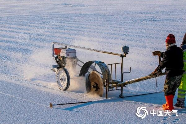 采冰是一项对技艺要求十分高的工种。采冰人需要推着专业的采冰车,先用锯片画出网格线,为锯出大小统一的冰块打下基础。网格线不能有偏差,否则就会产生大量的废品冰块。每条网格线都有百米长,中间不能断开。锯好的冰块需几人用专用的挂钩合力拉出,再通过简易输送轮传送到运输车上,供打造冰雕、冰灯等冰雪景观使用。