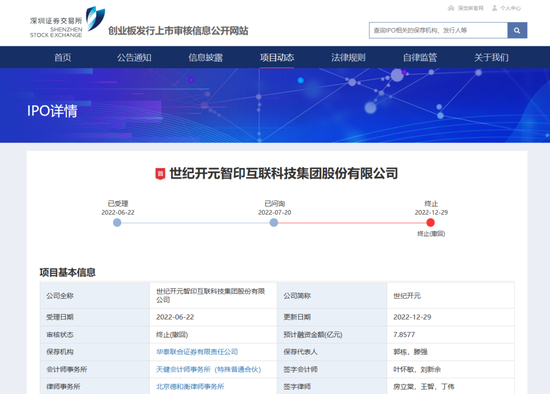 2、世纪开元智印互联科技集团股份有限公司:2022年12月28日,世纪开元智印互联科技集团股份有限公司申请撤回发行上市申请文件。根据《深圳证券交易所创业板股票发行上市审核规则》第六十七条,本所决定终止对其首次公开发行股票并在创业板上市的审核。
