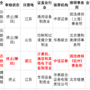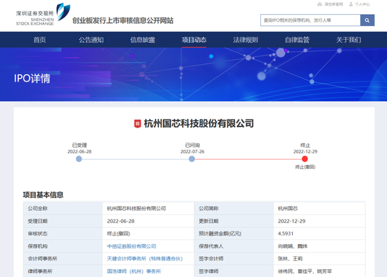 3、杭州国芯科技股份有限公司:2022年12月27日,杭州国芯科技股份有限公司的保荐人申请撤回发行上市申请文件。根据《深圳证券交易所创业板股票发行上市审核规则》第六十七条,本所决定终止对杭州国芯科技股份有限公司首次公开发行股票并在创业板上市的审核。