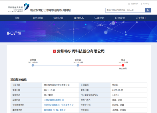 1、常州特尔玛科技股份有限公司:2022年12月28日,发行人申请撤回发行上市申请文件。根据《深圳证券交易所创业板股票发行上市审核规则》第六十七条,本所决定终止对其首次公开发行股票并在创业板上市的审核。