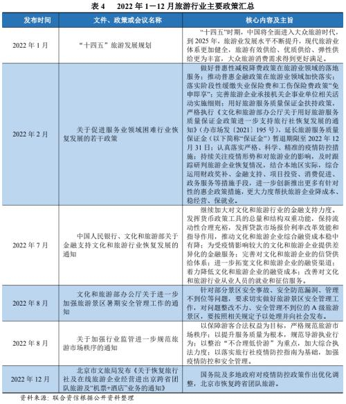 2022年,国务院、发改委、文化和旅游部等部门出台多项支持政策,从降税减费、稳岗就业、金融支持、刺激消费等方面来缓解旅游企业资金压力;12月以来疫情防控政策的持续优化调整,对旅游行业恢复发展意义重大。