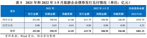 从存续债券来看,截至2022年9月底,旅游样本企业存续债券余额合计1081.25亿元,较2021年9月底债券余额(921.36亿元)增长17.35%,占同期末债券市场信用债余额(446920.55亿元)的比重为0.24%。2021年,样本企业新发行债券69支,发行规模452.00亿元,2021年到期规模390.95亿元;2022年1-9月,样本企业新发行信用债63支,发行规模415.70亿元,到期规模308.90亿元。由于旅游企业以国有企业为主,民营企业发债规模很小,截至2022年9月底,民营旅游企业存续债券余额仅4.55亿元。2021年和2022年1-9月,旅游企业债券发行规模均高于兑付规模,净融资额分别为61.05亿元和106.80亿元,整体呈净流入状态。