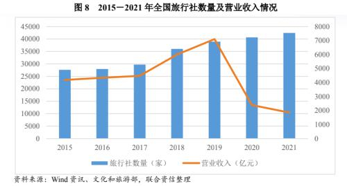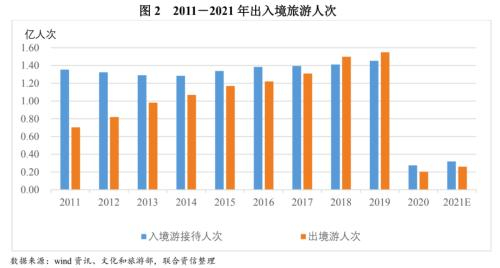 旅游业作为典型的敏感性行业,受疫情影响很大,2021年国内旅游业震荡复苏,2022年严峻的疫情形势使得旅游业复苏进程受挫,国内旅游收入及出游人次不及2021年,出入境旅游基本处于停滞状态。