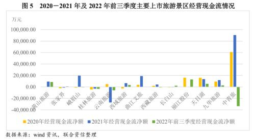 从国内主要上市旅游景区(13家样本)企业来看,2021年,黄山旅游、西域旅游、曲江文旅、天目湖、九华旅游和中青旅6家企业实现盈利,其余7家企业为亏损状态,亏损企业数量较2020年减少1家,13家企业利润总额合计呈亏损状态,亏损额较2020年基本持平。2022年前三季度,亏损企业数量扩大到9家,仅西域旅游、丽江股份、天目湖和中青旅实现微利,亏损总额较2021年大幅增加。从经营活动现金流情况看,2021年,黄山旅游、峨眉山、西域旅游、曲江文旅、西藏旅游、丽江股份、天目湖、九华旅游和中青旅9家企业经营活动现金流表现为净流入,其余4家企业为净流出,经营现金净流出企业数量较2020年减少2家,13家企业经营活动现金流合计表现为净流入,净流入额较2020年增加4.15亿元;2022年前三季度,国内主要上市旅游景区企业经营活动现金流表现较差,13家企业经营活动现金流合计表现为净流出(-0.82亿元),较2021年同期(16.81亿元)大幅下滑。