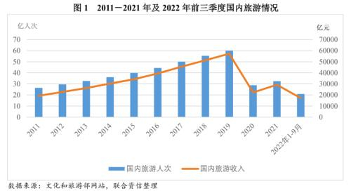 旅游业作为第三产业的主要支柱行业,对经济发展贡献较大,同时作为典型的敏感性行业,易受突发事件的冲击和影响。新冠三年,对旅游行业的冲击是巨大的。2020年,国内旅游人数和国内旅游收入同比分别下降52.1%和61.1%;2021年,随着国内疫情得到有效控制,旅游行业震荡复苏,国内旅游人数和国内旅游收入分别为32.46亿人次和2.92万亿元,同比分别增长12.8%和31.0%,但仅恢复至疫情前同期(2019年)的54.0%和51.0%;2022年以来,在动态清零政策下,多发疫情极大地限制了人们的出行,旅游行业复苏停滞,2022年1-9月,国内旅游人数20.94亿人次,比上年同期减少5.95亿人次,同比下降22.1%;同期,国内旅游收入1.72万亿元,比上年同期减少0.65万亿元,同比下降27.2%。