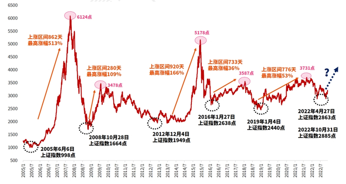 A股走势亦具有周期性。如果把牛市和熊市时间加起来,大约是三到四年一个周期,过去五轮的牛熊交替都符合这个规律。回过头来看当下的市场,此轮周期开启的时间是2019年1月,到现在快要四年了,目前多项估值指标显示A股处在底部,正在孕育开启新一轮周期。