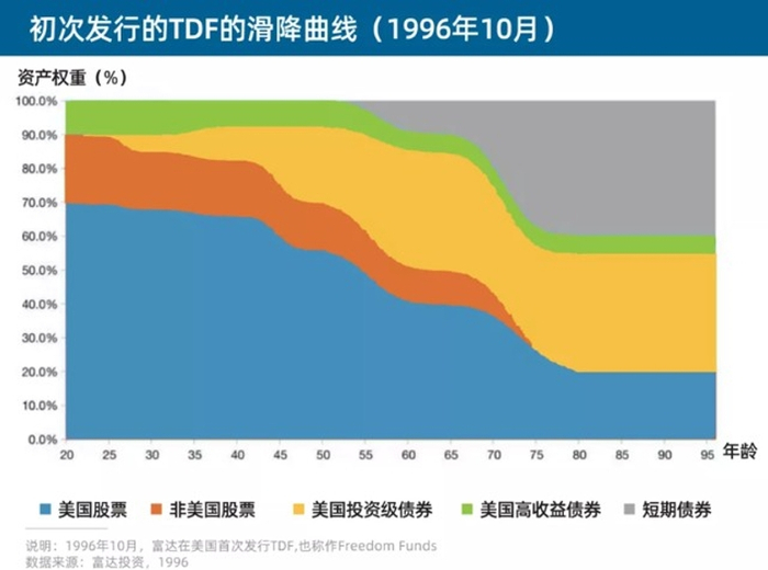 目标日期基金所采用核心模型的便是传说中的“下滑曲线”,随着退休日期的临近逐步降低权益资产的配置比例,它的原理是:“个人年龄和风险承受能力动态守恒,呈反向关系。” 同热力学能量守恒定律一样,都是自然规律。