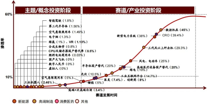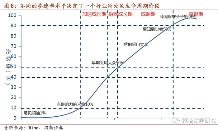 不同的渗透率水平决定了一个行业所处的生命周期阶段。2000年以来,四次大的赛道投资机会,行情结束时的渗透率大约在40%-60%之间(来源:招商证券)。从这个角度看,当前新能源、高端制造等热门赛道的行业渗透率仍有较大提升空间,值得怀抱星辰大海的期待。