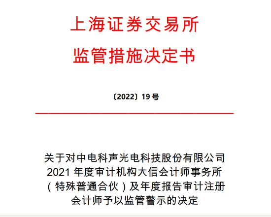 鉴于上述违规事实和情节,根据《股票上市规则》第 13.2.2 条和《上海证券交易所纪律处分和监管措施实施办法》有关规定,上海证券交易所(以下简称本所)作出如下监管措施决定:对中电科声光电科技股份有限公司年度报告审计机构大信会计师事务所(特殊普通合伙)及年度报告审计注册会计师杨昕、全义高予以监管警示。