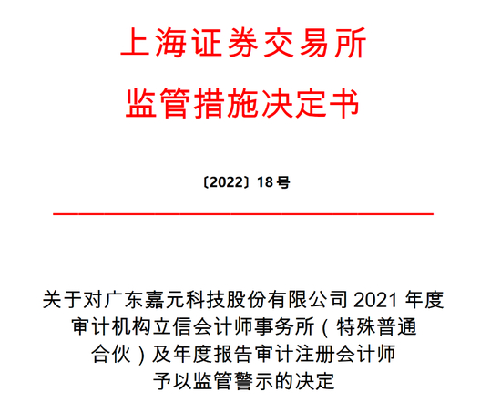 鉴于上述违规事实和情节,根据《股票上市规则》第 14.2.8 条和《上海证券交易所纪律处分和监管措施实施办法》有关规定,上海证券交易所(以下简称本所)作出如下监管措施决定:对广东嘉元科技股份有限公司年度报告审计机构立信会计师事务所(特殊普通合伙)及年度报告审计注册会计师李新航、陈驹健予以监管警示。