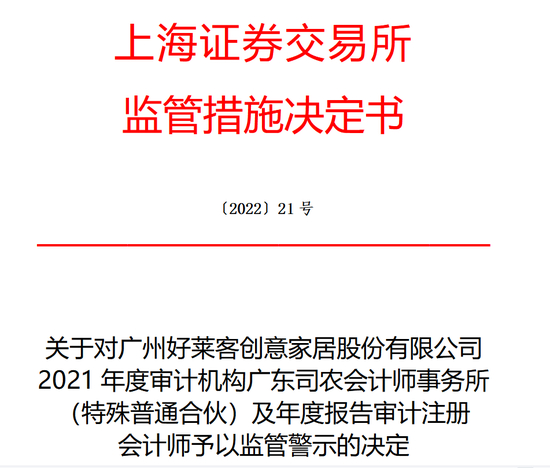 鉴于上述违规事实和情节,根据《股票上市规则》第13.2.2 条和《上海证券交易所纪律处分和监管措施实施办法》有关规定,上海证券交易所(以下简称本所)作出如下监管措施决定:对广州好莱客创意家居股份有限公司年度报告审计机构广东司农会计师事务所(特殊普通合伙)及年度报告审计注册会计师吴虹、潘小泉予以监管警示。