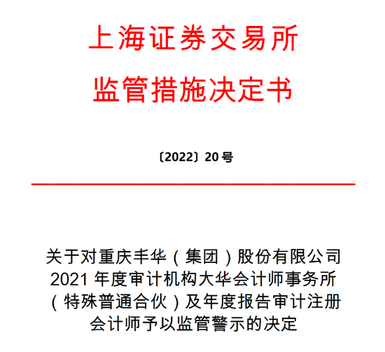 鉴于上述违规事实和情节,根据《股票上市规则》第 13.2.2 条和《上海证券交易所纪律处分和监管措施实施办法》有关规定,上海证券交易所(以下简称本所)作出如下监管措施决定:对重庆丰华(集团)股份有限公司年度报告审计机构大华会计师事务所(特殊普通合伙)及年度报告审计注册会计师蔡月波、杜亚芳予以监管警示。