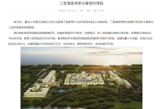 根据目前茅台置业官网介绍,三亚海棠湾地块筹划建设茅台度假村,计划总投资32.45亿元,预算较开始涨了10亿。