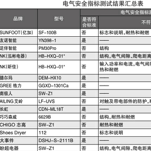 测试结果显示,15款鞋子烘干器样品中,有9款样品的电气安全指标测试结果存在不符合国家标准要求的情况。其中,在标志和说明测试项目中,SUNFOOT(亿加)SF-100B、Shoes Dryer112等2款样品不符合国家标准要求。