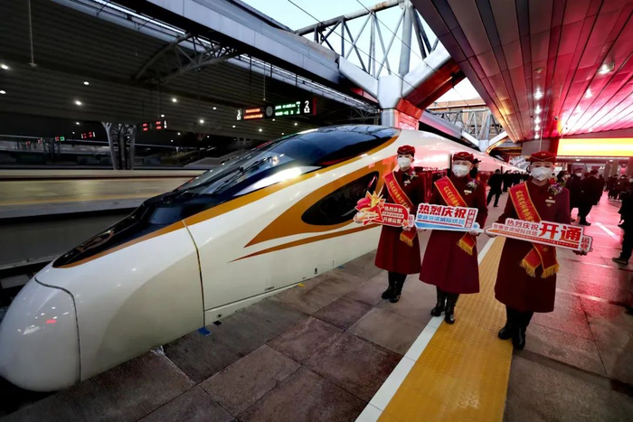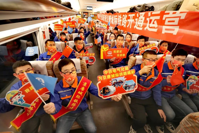 站台上,亲身参与了工程的几十名建设者们身穿制服,举起红色庆祝横幅,兴奋地在首发列车前拍照合影。“一定得来看看自己参与建设的工程!”中铁电气化局唐山站改造项目部党支部书记班利红感慨地说:“疫情给工程物资进场、人员组织都造成了很大困难,能如期开通运营,铁路人付出了巨大心血。”
