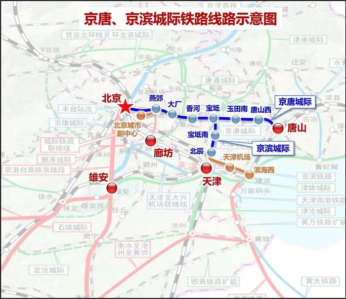 京唐城际铁路起自北京城市副中心站,经北京市通州区、河北省廊坊市、天津市宝坻区,进入河北省唐山市,接入天津至秦皇岛高铁唐山站,线路全长150公里,设计时速350公里,设北京城市副中心、燕郊、大厂、香河、宝坻、玉田南、唐山西、唐山8座车站,其中北京城市副中心站正在建设中,利用既有站改造的燕郊、唐山站及其他5座新建车站同步开通运营。