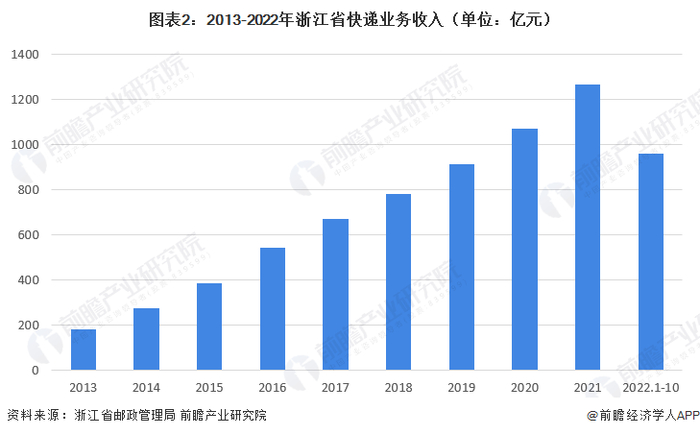 2013-2021年,浙江省快递服务企业业务收入也呈逐年上升的趋势,2021年累计完成1264.7亿元,同比增长18.1%。2022年1-10月,浙江省快递服务企业业务收入累计完成961.1亿元,同比下降4.1%。
