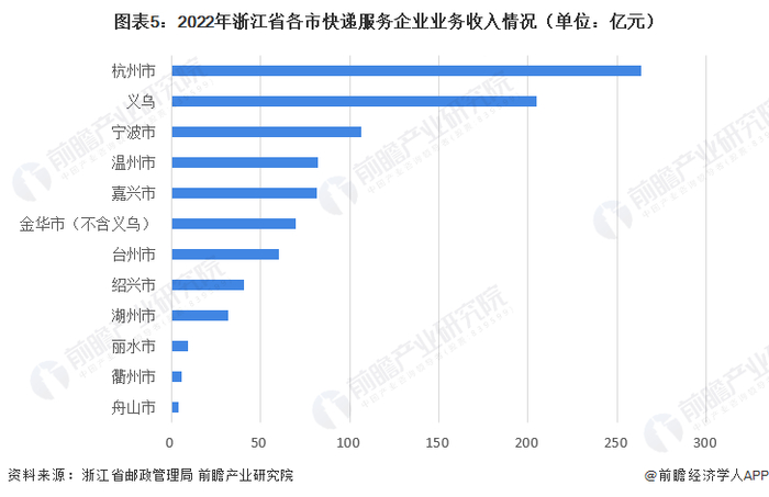 从浙江省各市快递服务企业业务收入情况来看,2022年1-10月,杭州市、义乌市、宁波市快递服务企业业务收入位于省内前三名,分别为263.18亿元、204.63亿元和106.52亿元。