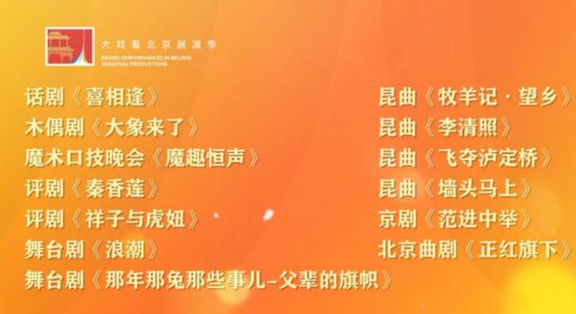 首届“大戏看北京”展演季以“文艺展新姿,精品献人民”为主题,为群众奉献精品好戏,后续线上云剧场有话剧《喜相逢》、木偶剧《大象来了》、评剧《秦香莲》、北京曲剧《正红旗下》、京剧《范进中举》、昆曲《牧羊记·望乡》、昆曲《李清照》等,线下剧目有话剧《人世间》、音乐诗剧《大河》、越剧《钱塘里》、京剧《楝树花》等,敬请期待。