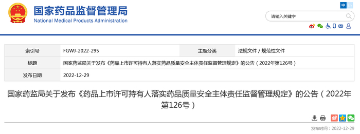 国家药监局关于发布《药品上市许可持有人落实药品质量安全主体责任监督管理规定》的公告(2022年第126号)