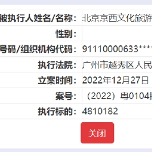 近日,《5D调查》查阅中国执行信息公开网发现,北京京西文化旅游股份有限公司新增一条被执行人信息,执行标的481万余元,执行法院为广州市越秀区人民法院。