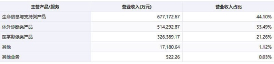 深圳迈瑞生物医疗电子股份有限公司主要从事医疗器械的研发、制造、营销及服务,主要产品涵盖三大领域:生命信息与支持、体外诊断以及医学影像。分别占比44.10%、33.49%、21.26%。