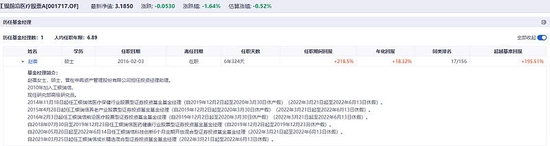 有8.1年的投资经理经验,在任管理6只产品,管理总规模为243.59亿。