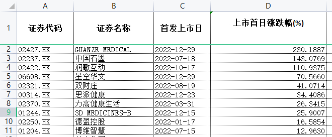 2022年新股中,上市首日表现最好的是年末上市的Guanze Medical,首日收盘上涨超230%。其次为中国石墨,首日收盘涨幅为143.08%,第三名为润歌互动,首日收盘涨幅为110.94%。2022年港股市场上市首日大涨的新股,基本有市值小、估值低、处于热门赛道等特征。