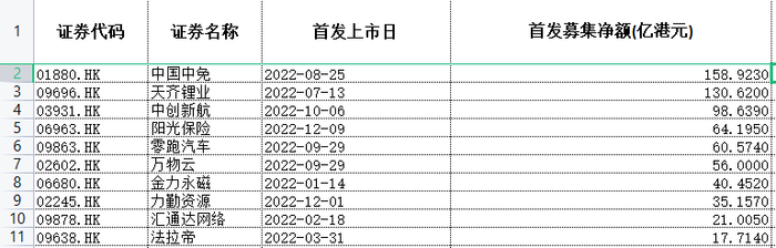 2022年有两只超大型新股首发募资净额过百亿港元,分别为中国中免(158.92亿港元)、天齐锂业(130.62亿港元)。而第三名中创新航则实现了98.63亿港元的募资净额。此后新股募资净额排名为阳光保险(64.2亿港元)、零跑汽车(60.57亿港元)。