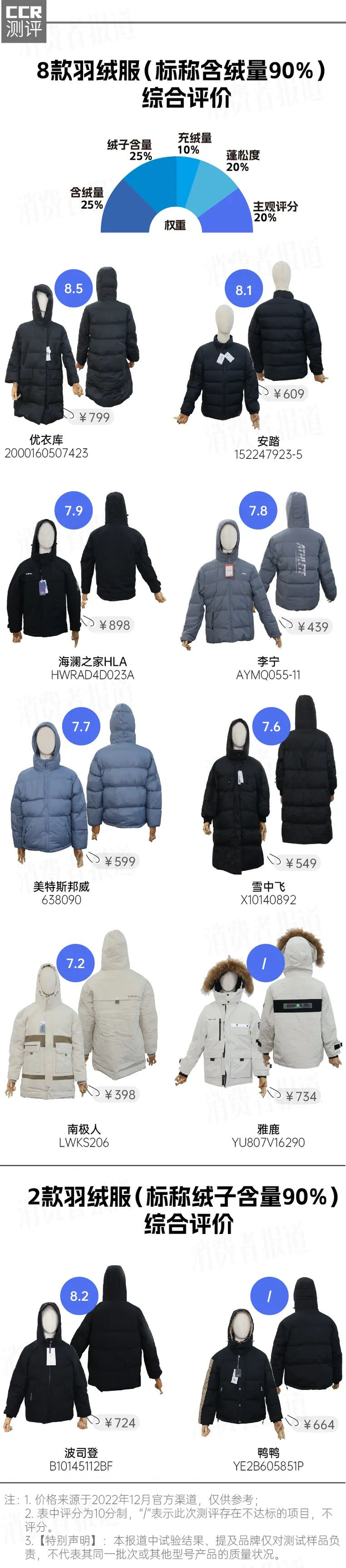 2022年12月,《消费者报道》选购了市面上较热销的10款羽绒服进行多项测试,品牌包括波司登、优衣库、安踏、李宁、美特斯邦威、海澜之家HLA、雪中飞、南极人、雅鹿、鸭鸭。