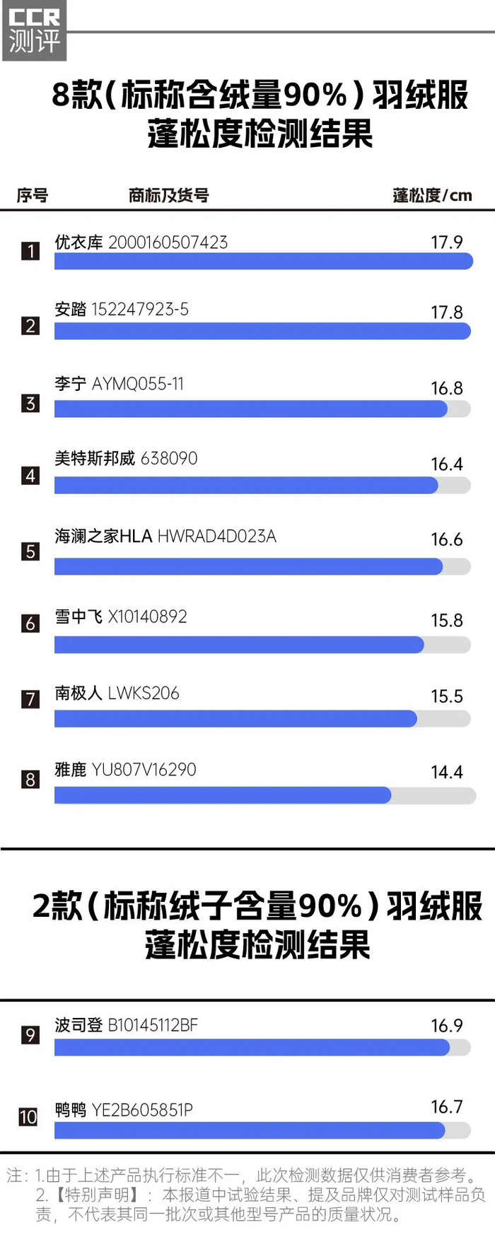 此次检测的10款羽绒服均为鸭绒,结果显示,优衣库、安踏蓬松度高,分别高达17.9cm和17.8cm,而南极人、雅鹿差强人意,仅为15.5cm和14.4cm。