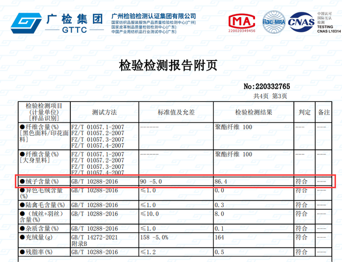 根据新国标GB/T 14272-2021《羽绒服装》,绒子含量90%的羽绒服的绒子含量允许偏差≥-5%。而鸭鸭羽绒服实测的绒子含量为83.1%,绒子含量偏差为-6.90%,未达到其标注的GB/T 14272-2021标准。