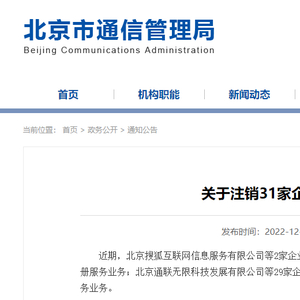 为维护市场秩序,保障用户合法权益,我局于2022年11月10日公示了拟注销域名注册服务许可企业的相关信息,听取社会意见,接受社会监督。现公示期满,未收到异议。经审核,北京搜狐互联网信息服务有限公司等31家企业符合退出电信业务市场条件,根据《互联网域名管理办法》(工业和信息化部令第43号)规定,现在注销其北京地区域名注册服务许可。