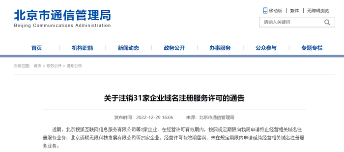 北京市通信管理局:注销31家企业域名注册服务许可