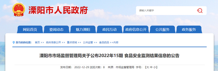 江苏省溧阳市市场监督管理局公布2022年15期食品安全监测结果信息
