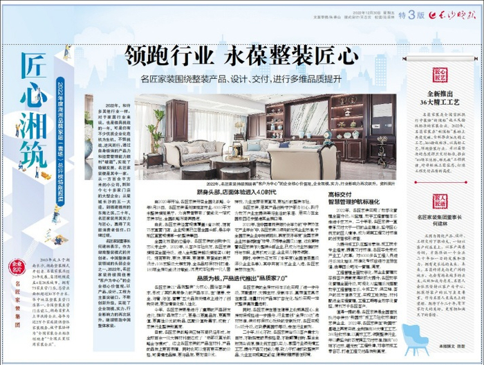名匠家装董事长何建林表示,作为湖南整装模式的开创者,中国整体家装领域的头部企业之一,2022年,名匠家装持续围绕着“客户为中心”的企业核心价值观,以产品、设计、工程为主要突破口,不断创新升级,实现了企业规模、实力、行业影响力的再次跃升,继续领跑中国整体家装。