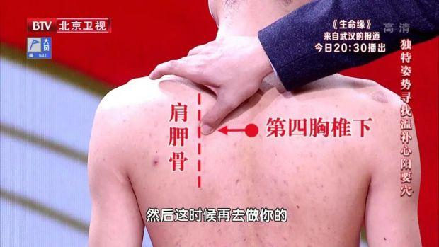 温补心阳的穴位是膏肓穴。坐在椅子上,双手抱肩,从大椎往下数,第四胸椎的棘突下凹陷,水平移动到肩胛骨的边缘处。在这个穴位艾灸20~40分钟,能温补心阳,让心的搏动能力增强。
