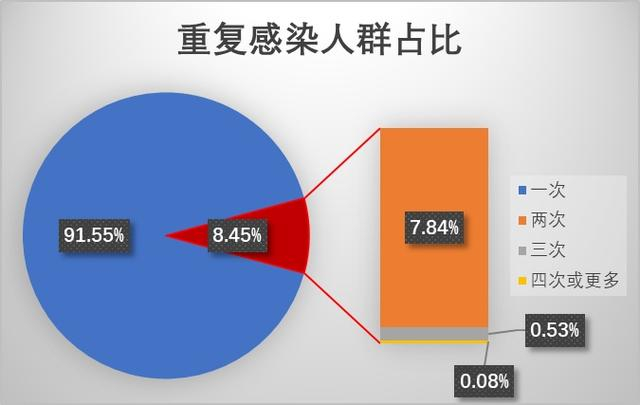 根据英国政府报告[1]统计,2020年7月至 2022年11月期间有 6.75% 的感染者发生了重复感染,重复感染者中93.4% 发生在奥密克戎流行期间。