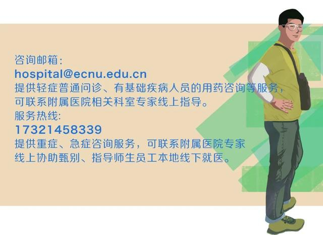 ►1.咨询邮箱:hospital@ecnu.edu.cn提供轻症普通问诊、有基础疾病人员的用药咨询等服务,可联系附属医院相关科室专家线上指导。