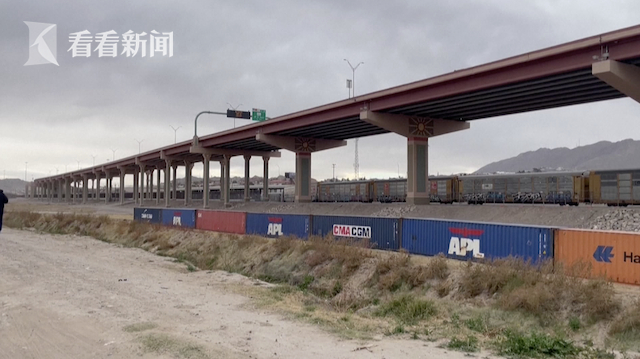 当地时间28日,在墨西哥北部边境城市华雷斯附近,一字排开的集装箱以及严阵以待的美国边境巡逻队,成了移民们难以逾越的天堑。