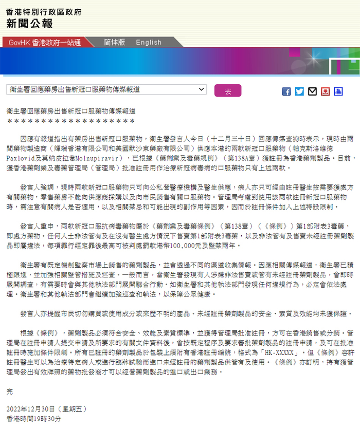 12月30日,据香港特区政府新闻公报,因应有报道指出有药房出售新冠口服药物,香港卫生署发言人今日回应表示,现时由两间药物制造商(辉瑞香港有限公司和美国默沙东药厂有限公司)供应本港的两款新冠口服药物(Paxlovid及莫纳皮拉韦Molnupiravir),已根据《药剂业及毒药规例》(第138A章)获注册为香港药剂制品。目前,获香港药剂业及毒药管理局(管理局)批准注册用作治疗新冠病毒病的口服药物只有上述两款。
