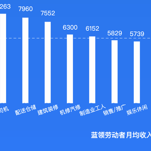 “司机”、“配送仓储”、“建筑装修”从业者的平均月均工资收入较高,依次为8263元、7960元和7552元。第三产业中典型职业的蓝领劳动者月均工资高于第二产业蓝领劳动者。