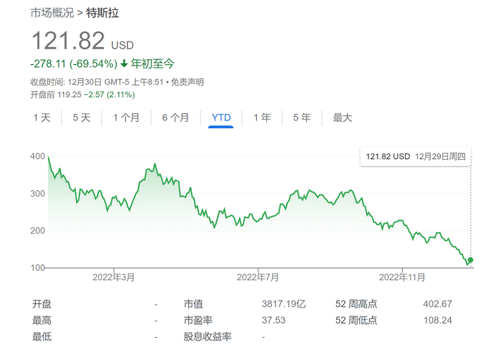 最令人意外,还是当属特斯拉。年关将至,特斯拉的股价却开启了“连跌模式”,今年迄今的跌幅已超过70%,市值也较年初的1.06万亿美元缩水幅度超过7100亿美元。