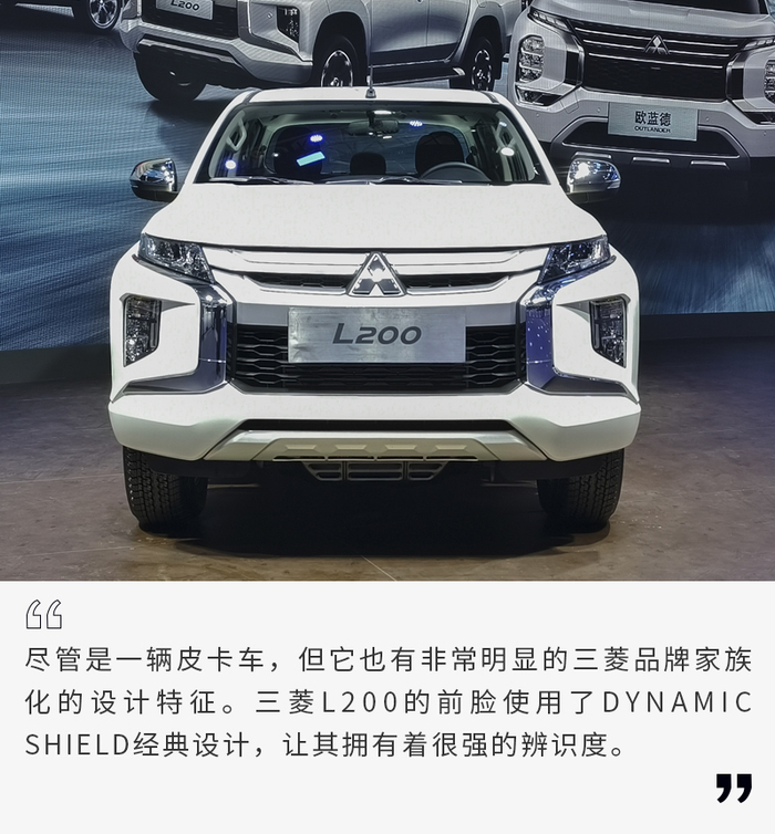 在三菱最新设计语言的加持下,使得三菱L200的前脸看上去非常的精致,很有档次感,且细长的灯组以及富有张力的前保险杠的设计让其很有视觉冲击力,同时也有很强的运动感。而车身和车尾的造型设计则相对简约干练一些。整体来说,三菱L200的外观动感时尚,符合现在趋于年轻化的国内市场。