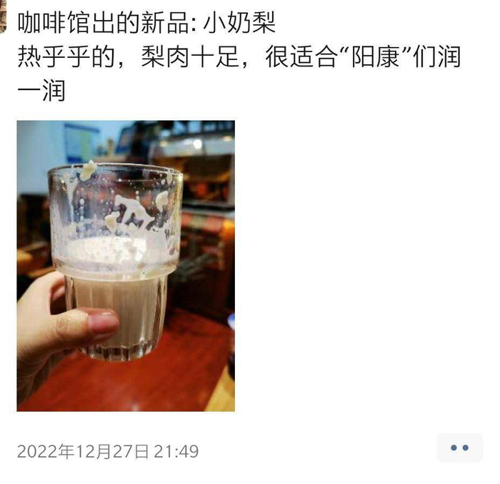 在济南的千佛山医院,也有一家名为GK café的咖啡馆,其投资人日前还在朋友圈晒出咖啡馆新品“小奶梨”,配文称:热乎乎的,梨肉十足,很适合“阳康”们润一润。