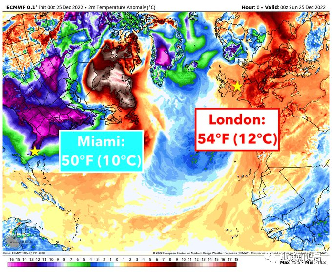 美国国家气象局25日称,除西南部加利福尼亚州等少数地区外绝大多数地区气温下降至低于往年平均水平,甚至包括南部素来温暖的得克萨斯州、佐治亚州和佛罗里达州。以热带气候而闻名的迈阿密,气温居然比高纬度的伦敦还低2度。