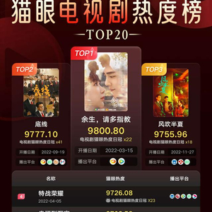 2022年电视剧热度榜前三位分别为《余生,请多指教》《底线》《风吹半夏》。其中由杨紫和肖战领衔主演的《余生,请多指教》成为2022年热度最高电视剧TOP1,在播放期间共获得22次电视剧热度日冠和16次卫视直播关注度日冠;由靳东、成毅、蔡文静主演的《底线》,和赵丽颖、欧豪、李光洁主演的《风吹半夏》,分别位列TOP2和TOP3。