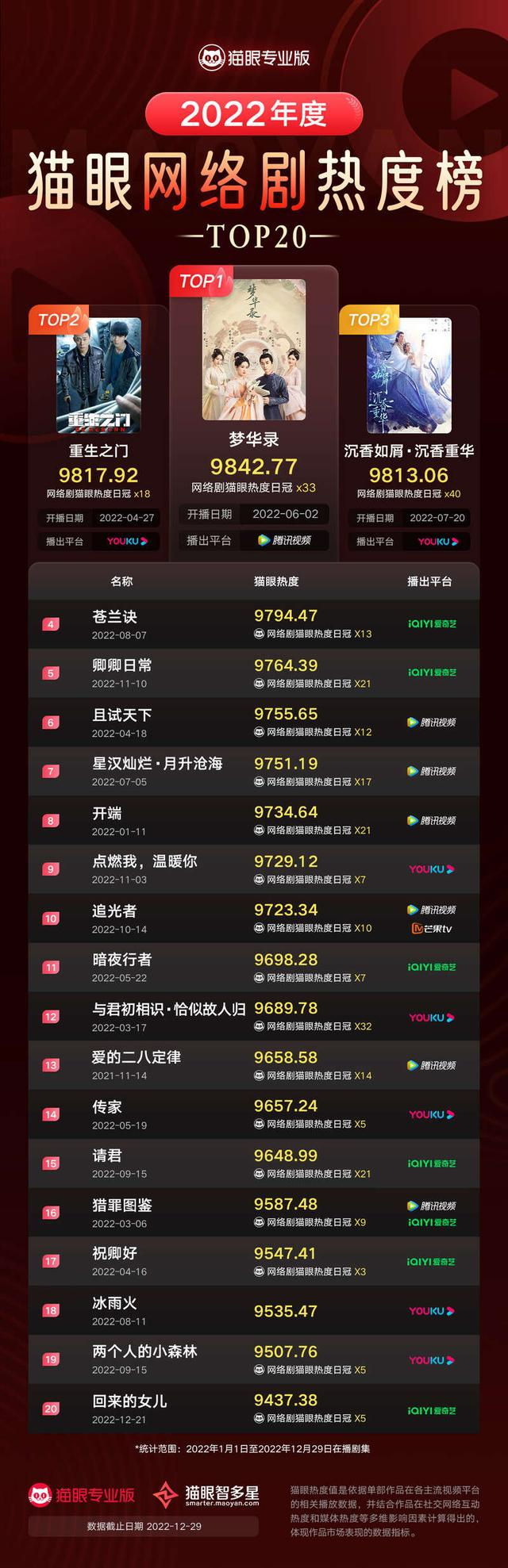 网剧方面,由刘亦菲和陈晓主演的《梦华录》登上2022年度猫眼网络剧热度榜TOP1,也是剧集热度总榜冠军、古装剧热度冠军以及爱情剧热度冠军;获得网络剧热度榜TOP2和TOP3的分别为张译、王俊凯主演的《重生之门》和杨紫、成毅主演的《沉香如屑·沉香重华》。同时,《重生之门》也是2022年度猫眼悬疑剧热度冠军。